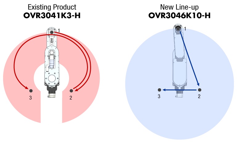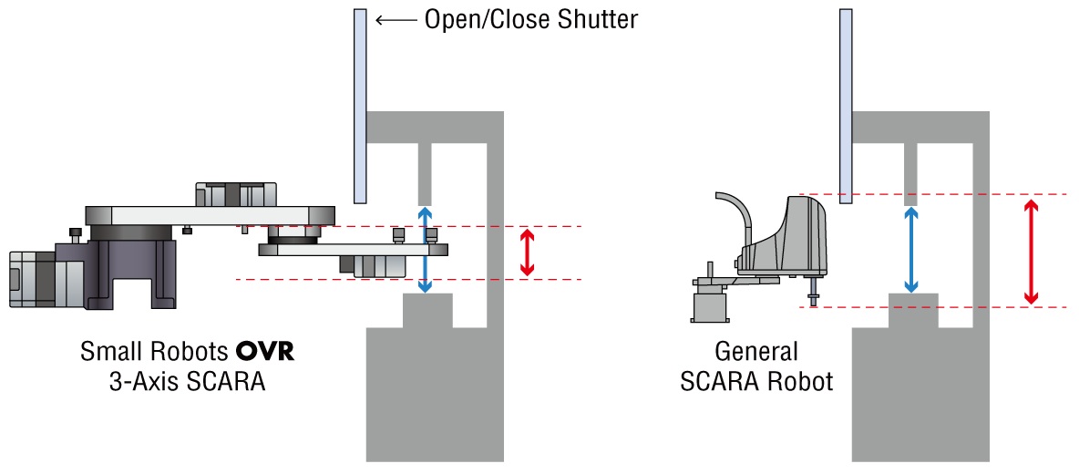 The height of the robot tip can be reduced, allowing the robot to approach narrow spaces. Compatible with a wide range of vertical operations.