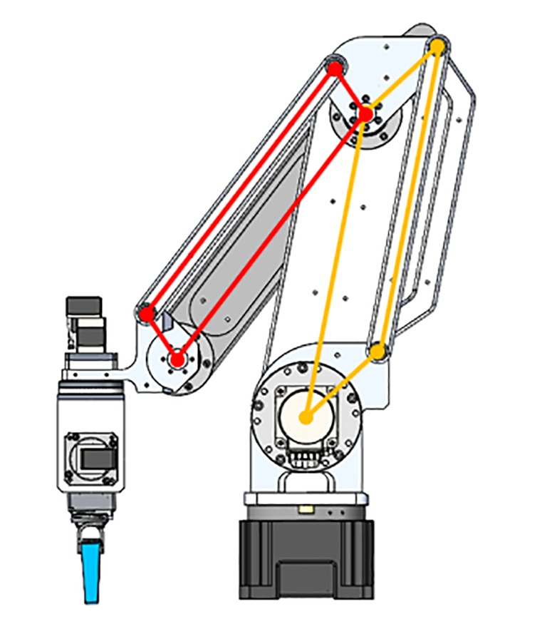 - Maximum Payload of 5 kg: This is achieved by placing the motors that drive the 2 arms below, thereby reducing the weight on the joints.